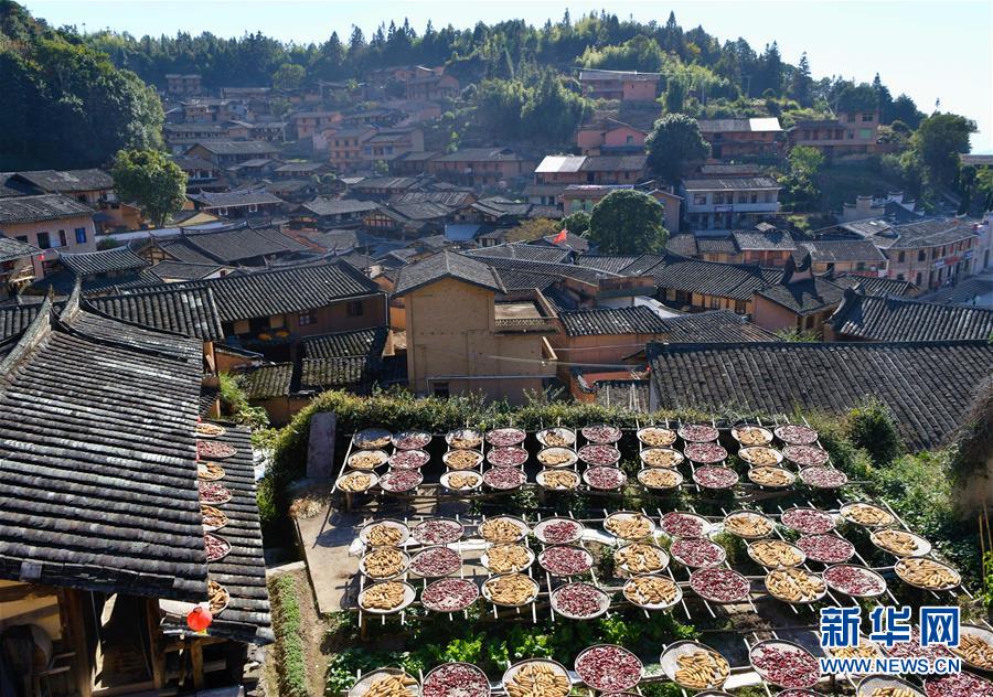这是11月1日拍摄的桂峰村晒秋画面。 深秋时节,位于福建省三明市尤溪县洋中镇的桂峰村,古民居与晒匾里五彩缤纷的农作物,构成五彩斑斓的调色板,展现秋收风情。 新华社记者魏培全摄