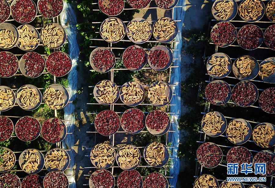 这是11月1日拍摄的桂峰村晒秋画面(无人机照片)。 深秋时节,位于福建省三明市尤溪县洋中镇的桂峰村,古民居与晒匾里五彩缤纷的农作物,构成五彩斑斓的调色板,展现秋收风情。 新华社记者魏培全摄