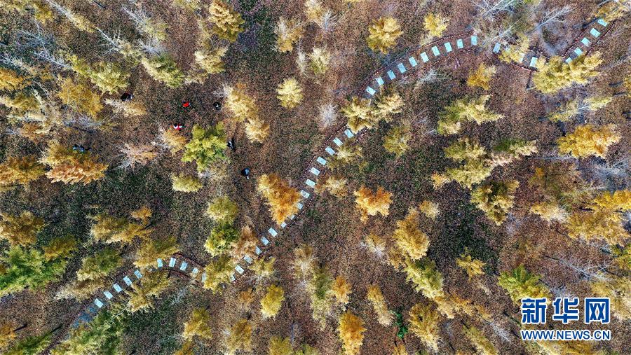 曲周县银杏种植基地一景(11月2日摄,无人机照片)。 眼下,河北省邯郸市曲周县银杏种植基地近千亩银杏林进入最佳观赏期,吸引众多游客前来游览。 新华社记者 朱旭东 摄