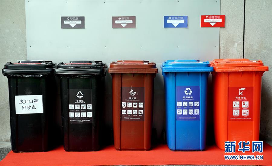 11月6日,在进博会场馆内拍摄的按颜色分类的垃圾桶。今年特别增设了废弃口罩回收桶。新华社记者 刘颖 摄