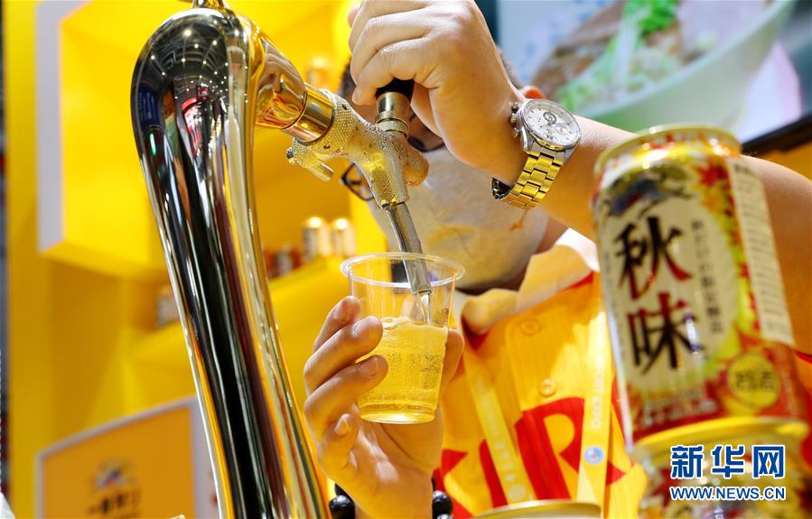 11月7日,工作人员在进博会食品及农产品展区麒麟啤酒展台上倒啤酒。新华社记者 方喆 摄