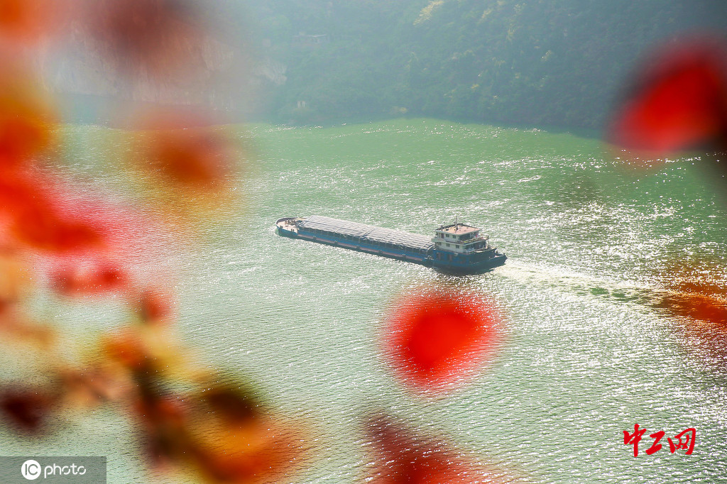 2020年11月11日,轮船行驶在湖北省秭归县屈原镇兵书宝剑峡水域。立冬过后,长江三峡库区成片的黄栌树叶渐次显红露紫,似彩霞一般飘落峡江悬崖之上,与生态屏障区的青山绿水相映成景,正值最佳观赏季。(王罡/IC photo)