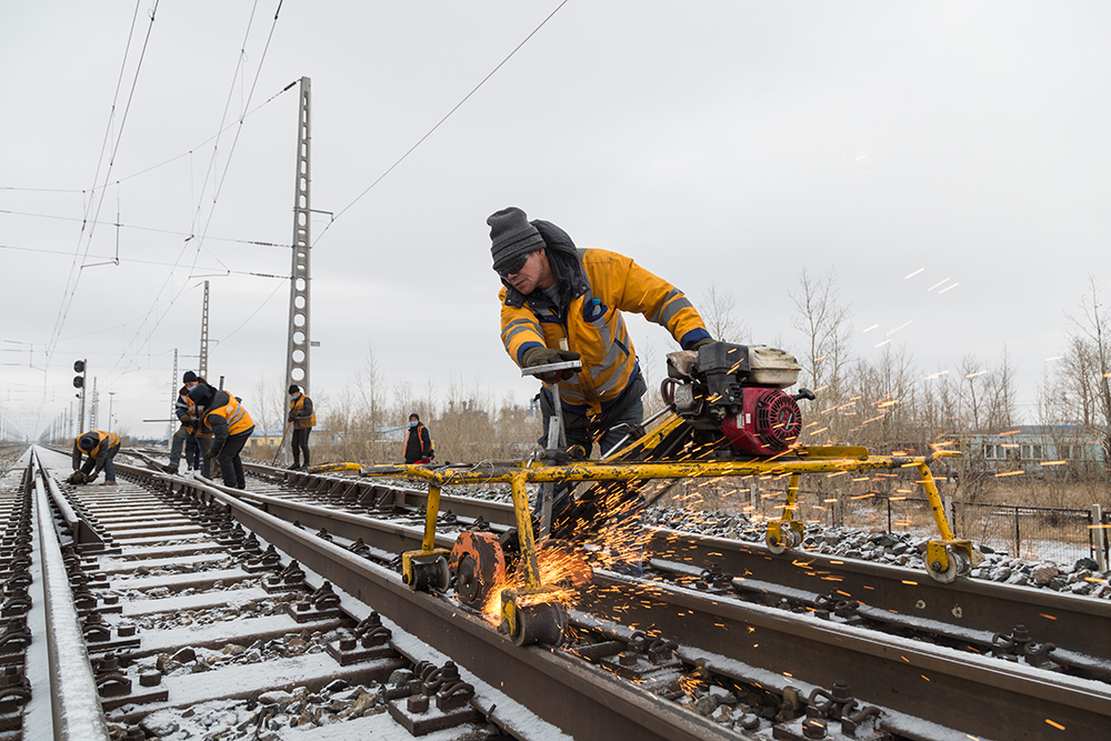 图为11月12日上午9点,海拉尔工务段海拉尔线路车间职工对海拉尔南站道岔进行整修