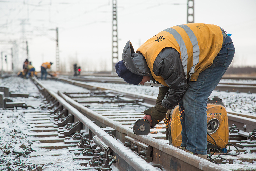 图为11月12日上午9点,海拉尔工务段海拉尔线路车间职工对海拉尔南站道岔进行整修