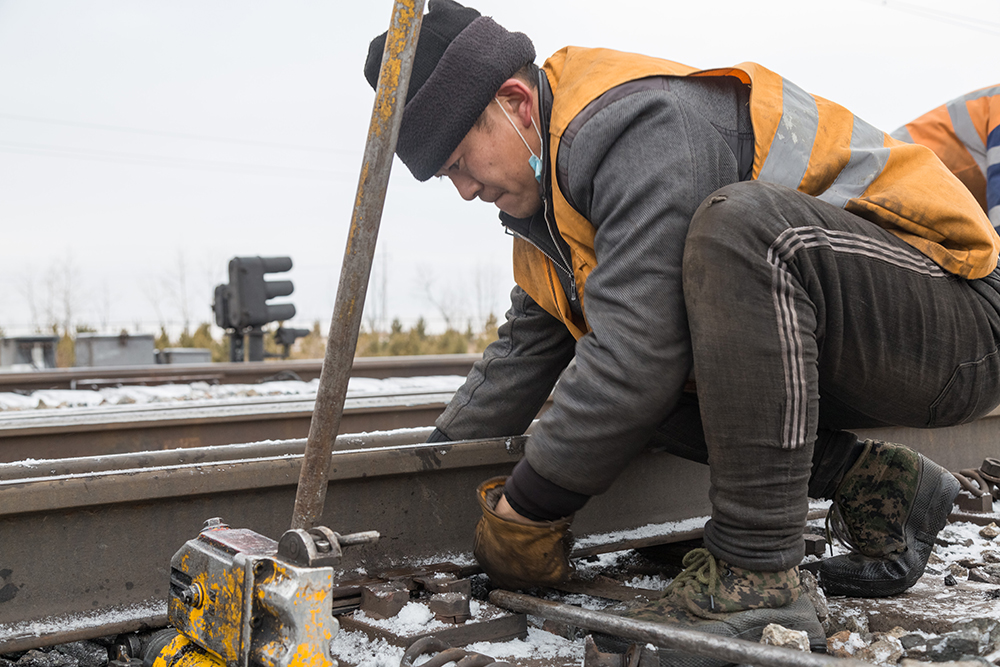 图为11月12日上午9点,海拉尔工务段海拉尔线路车间职工对海拉尔南站道岔进行整修。