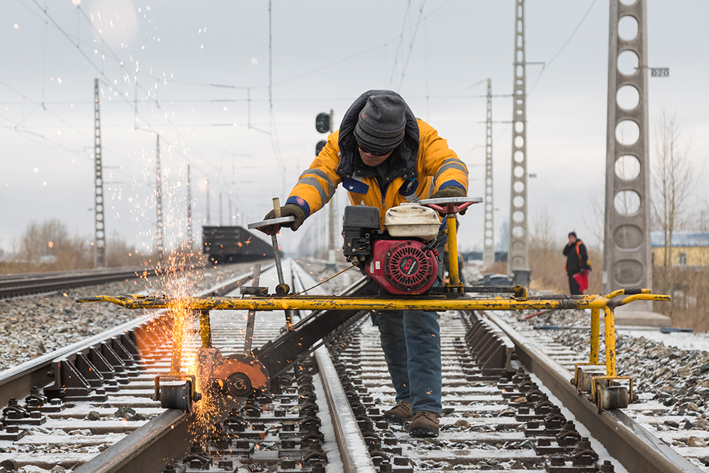 图为11月12日上午9点,海拉尔工务段海拉尔线路车间职工对海拉尔南站道岔进行整修。