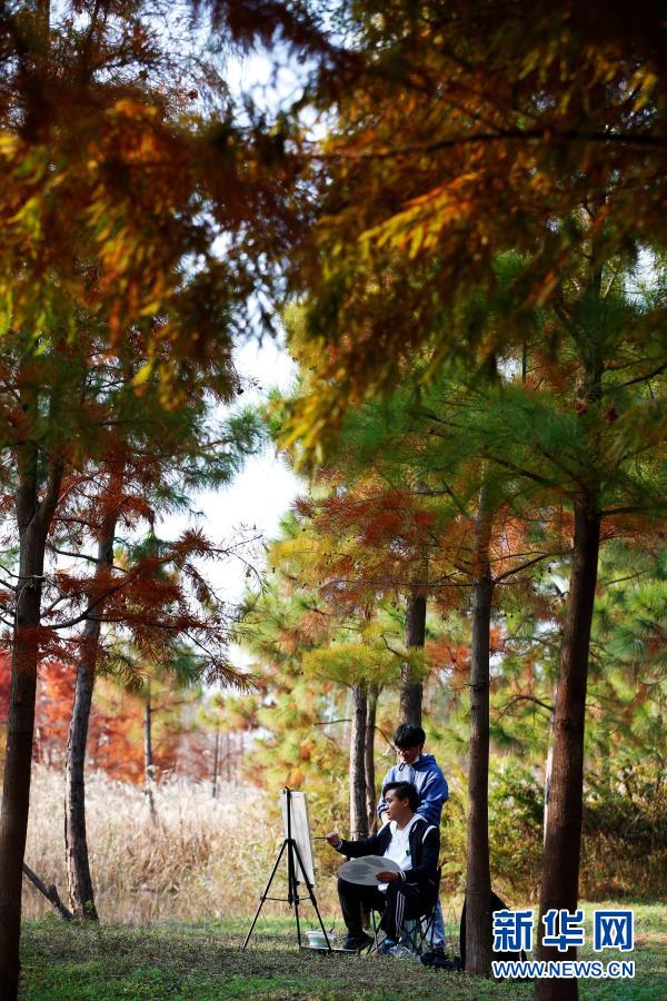 11月15日,绘画爱好者在江苏省泗洪县洪泽湖湿地的杉树林中写生。