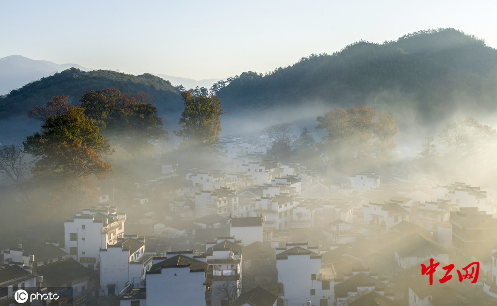 2020年11月14日,初冬早晨,江西婺源县大鄣山乡石城村炊烟缭绕,高大的红枫与一幢幢粉墙黛瓦的徽派民居在晨曦下若隐若现,宛如一幅水墨画,吸引众多游客前来观赏。(胡敦煌/IC photo)