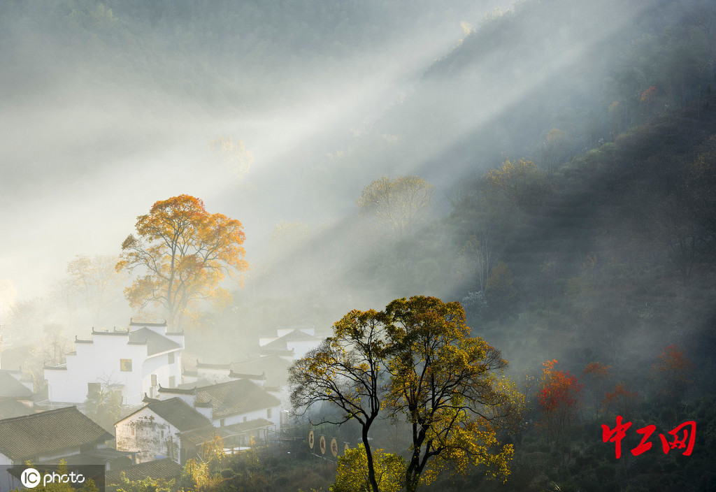 2020年11月14日,初冬早晨,江西婺源县大鄣山乡石城村炊烟缭绕,高大的红枫与一幢幢粉墙黛瓦的徽派民居在晨曦下若隐若现,宛如一幅水墨画,吸引众多游客前来观赏。(胡敦煌/IC photo)