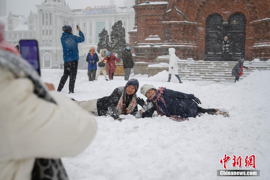 11月19日,黑龙江省哈尔滨市迎来大暴雪天气,虽给当地市民交通出行带来不便,但也营造了银装素裹的冬季美景。图为游客在索菲亚教堂前拍照留念。中新社记者 吕品 摄