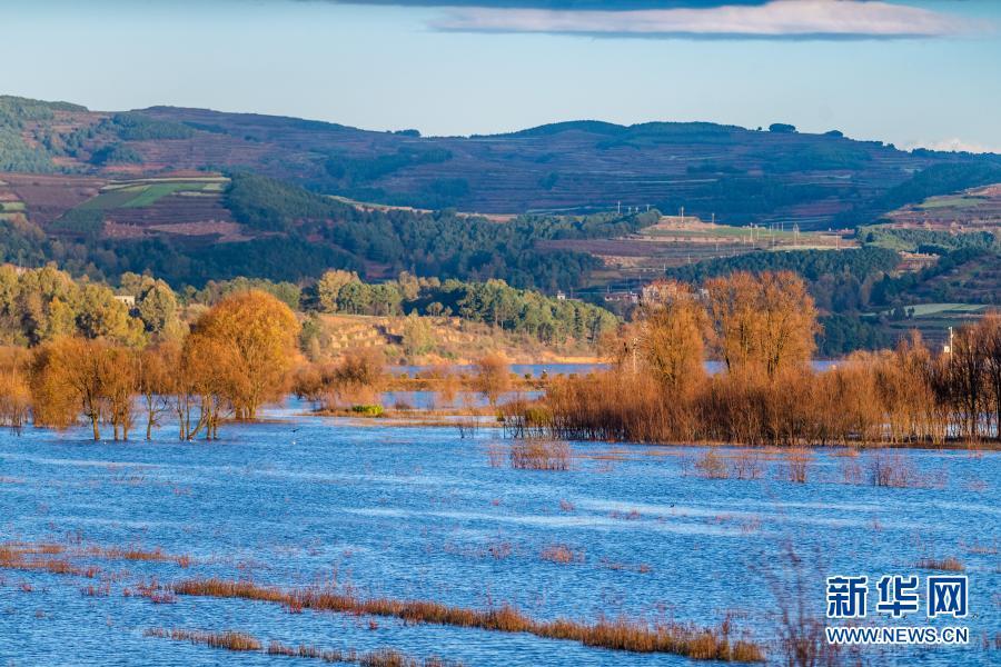 11月20日拍摄的念湖一景。念湖位于云南省曲靖市会泽县境内,海拔约2500米。冬日里,念湖清澈透亮的湖水与水草、树木、山峦、村庄形成一幅美丽的画卷。新华社记者 胡超 摄