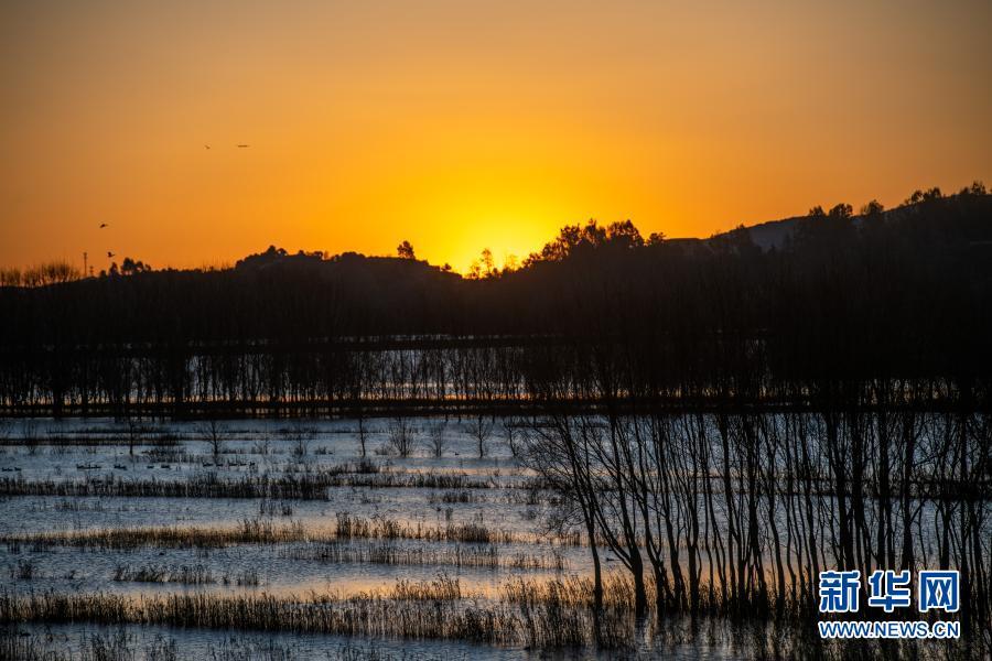 11月19日拍摄的念湖一景。念湖位于云南省曲靖市会泽县境内,海拔约2500米。冬日里,念湖清澈透亮的湖水与水草、树木、山峦、村庄形成一幅美丽的画卷。新华社记者 胡超 摄