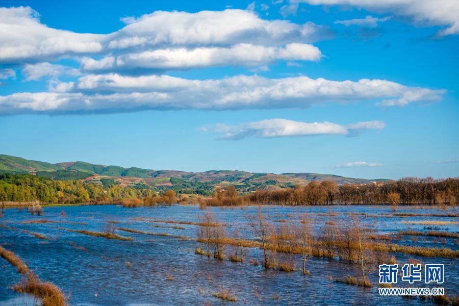 11月18日拍摄的念湖一景。念湖位于云南省曲靖市会泽县境内,海拔约2500米。冬日里,念湖清澈透亮的湖水与水草、树木、山峦、村庄形成一幅美丽的画卷。新华社记者 胡超 摄