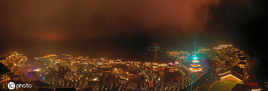 2020年11月29日,航拍江西省上饶市铅山县葛仙山景区灯光秀,在空中看去,夜色下的灯光秀犹如满天繁星。铅山县葛仙村旅游度假区,通过文化融入、夜游引爆、名人引流等具体措施,在短时间内催生了超高人气,成为江西文旅产业的新地标和大爆点。