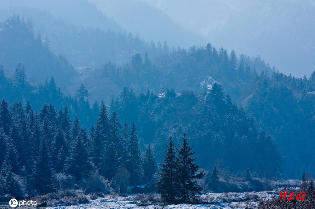 2020年12月2日,拍摄的雪后祁连山银装素裹分外妖娆 似丹青画卷。由于受冷湿气流影响,祁连山区连续两天降下大雪,雪后位于祁连山北麓的甘肃张掖肃南裕固族自治县马蹄乡境内的雪山、峡谷、冰川、森林、草甸、丹霞在皑皑白雪映衬下到处银装素裹,更显雄美壮丽, 犹如一幅美丽的丹青画卷。(王将/IC photo)