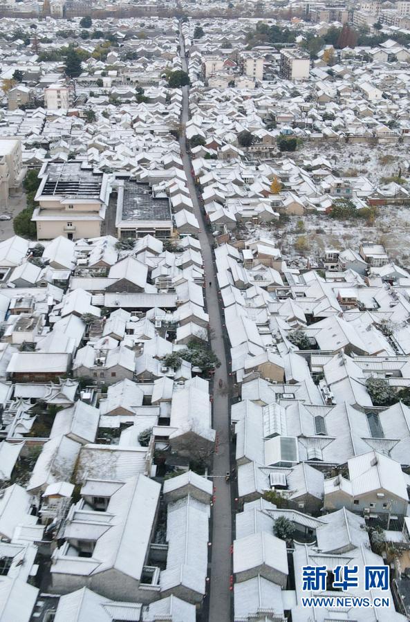 12月14日拍摄的江苏省扬州市东关街雪景(无人机照片)。