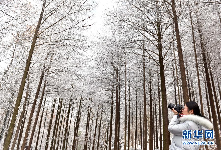 12月14日,游客在安徽省巢湖市东庵森林公园景区内拍摄雪景。