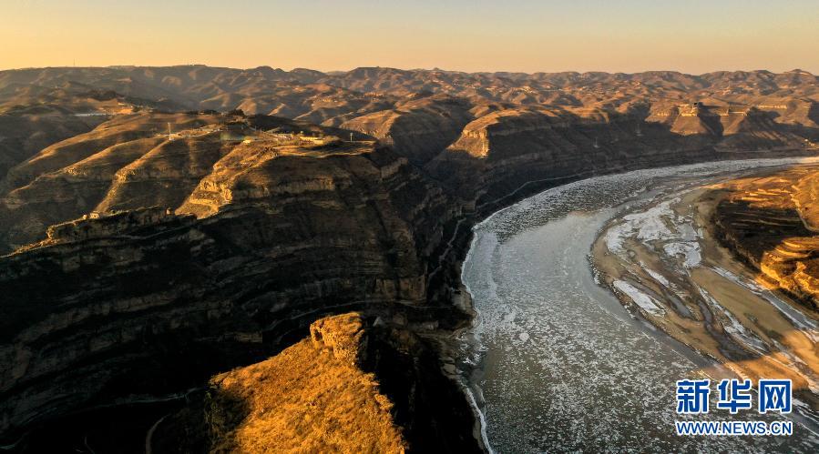 会峰寨“依偎”黄河,成为一道独特的风景(12月15日摄,无人机照片)。
