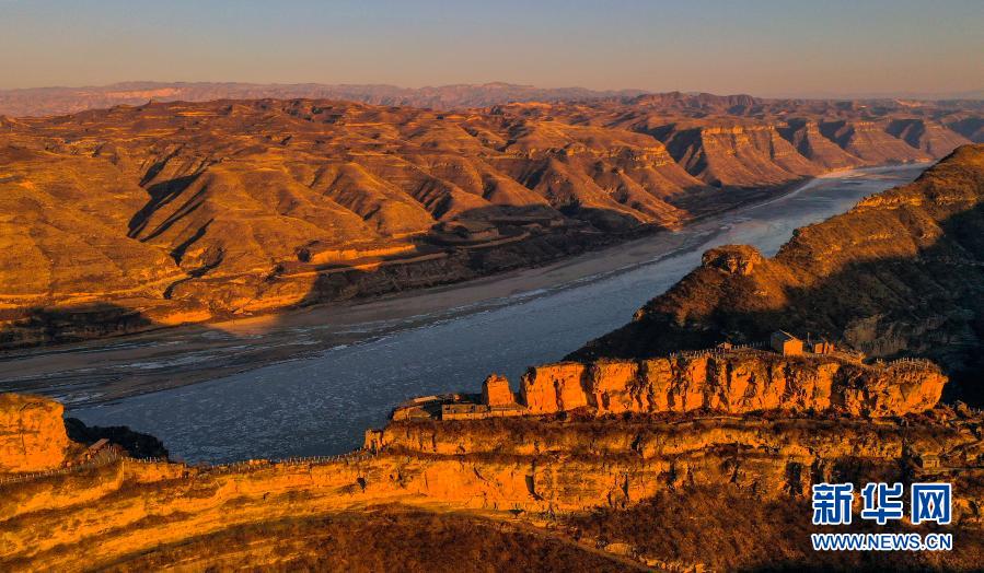 会峰寨“依偎”黄河,成为一道独特的风景(12月15日摄,无人机照片)。