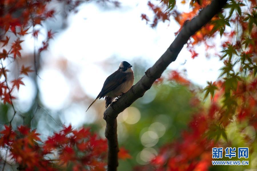 12月15日,在上海闵行区莘庄公园枫叶丛中拍摄的白头鹎。