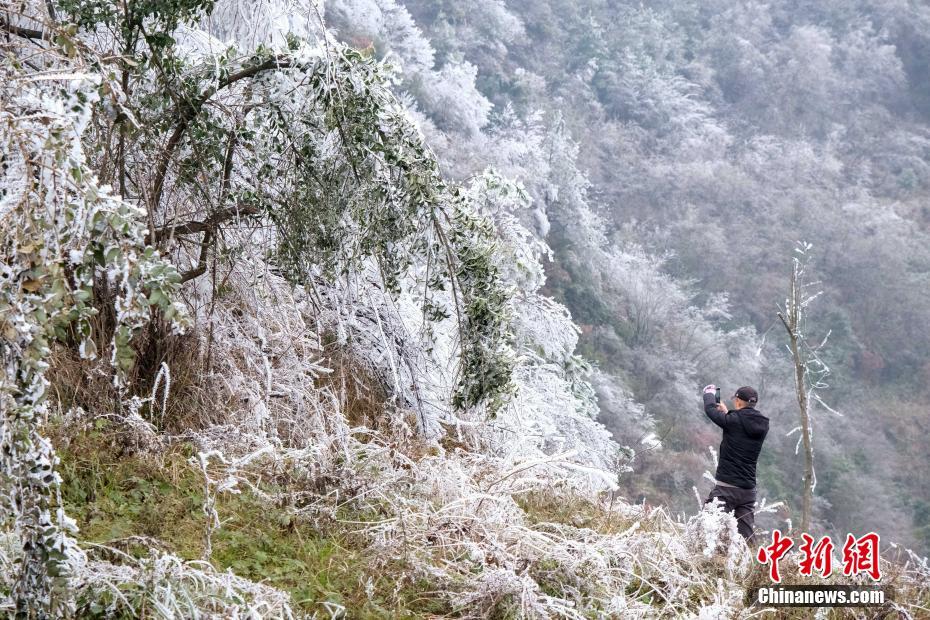 12月19日,受多日强冷空气影响,贵州省贵阳市白云区牛场布依族乡云雾山地势较高地带出现雾凇景象,一眼望去冰天雪地,漫山遍野铺满冰晶,景色宜人,美不胜收。图为游客在用手机拍摄雾凇美景。 乔啟明 摄