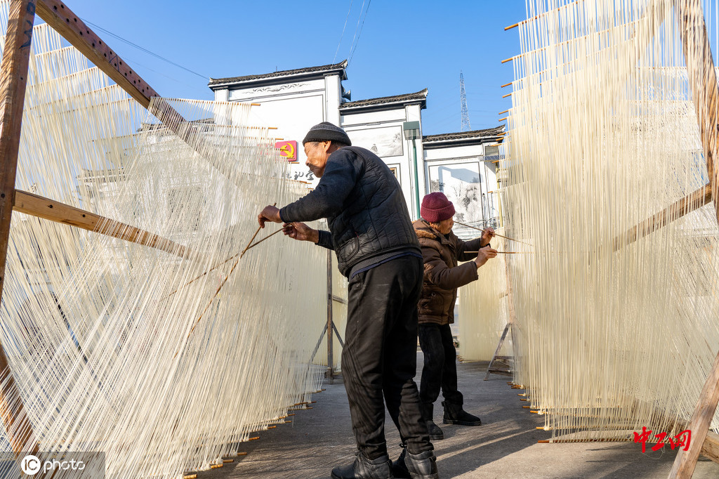 2020年12月22日,浙江金华,冬日里的浦江县潘周家村晒场上,挂面如帘香气四溢。阳光下,只见村民在数十个面架间来回穿梭,手持面杆在细长滑润的面帘上下梳理。细细长长的面条像千万根琴弦,像在太阳底下不停地拨动着琴弦。