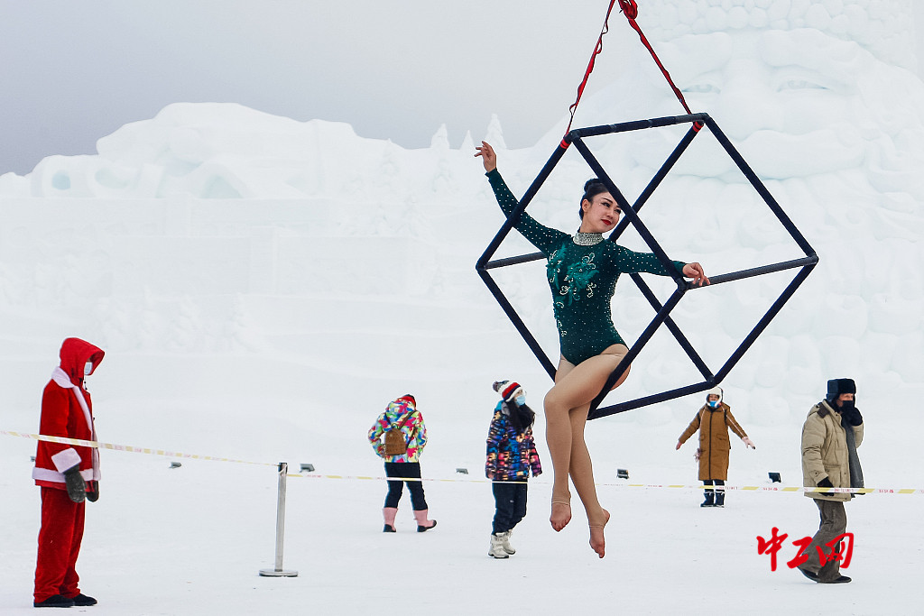 2020年12月22日,2020第六届漠河钢管舞极寒挑战赛第二场空中舞蹈,在北极圣诞村唯美上演。队员们穿着轻薄舞蹈服,耐住极寒,挑战极限,在魔方、吊环中尽情展示优美舞姿。欧式建筑,精美雪雕,冰雪天地,唯美舞姿在北极圣诞村构成一道最美风景线,将本轮赛事活动推向高潮。(视觉中国)