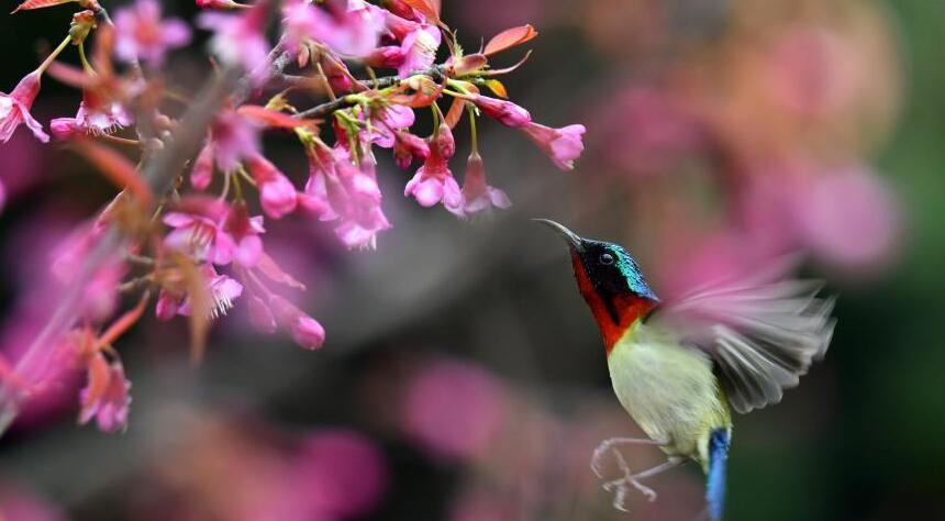 贵阳:冬樱花开引鸟来