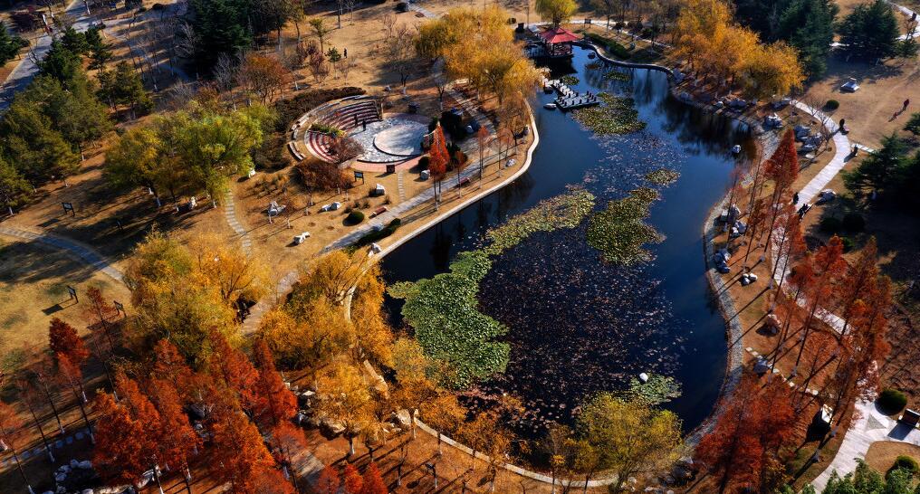 航拍山东蓬莱红杉树 火红绚丽