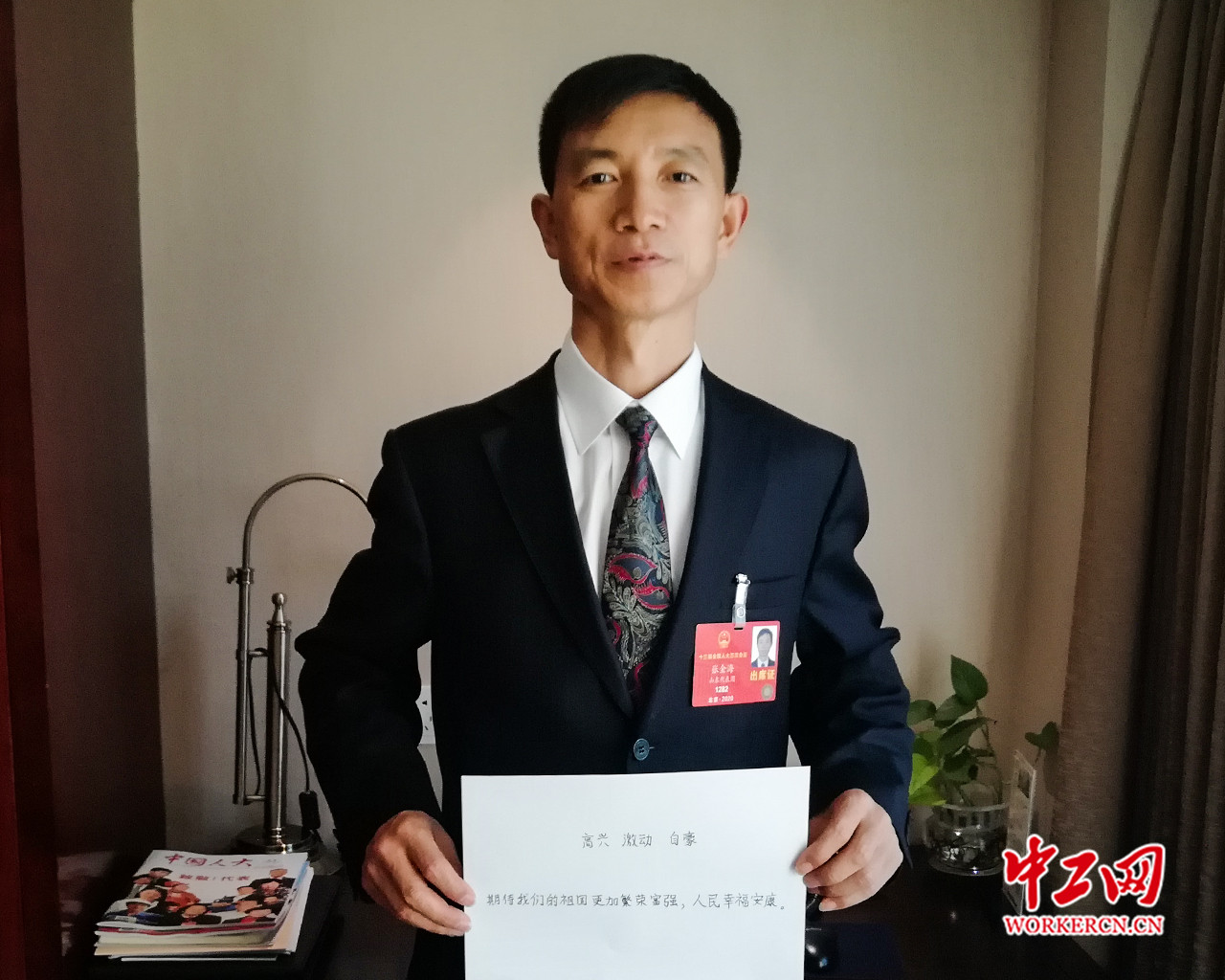 张金海,山东东营环卫工人,2020全国两会寄语:“高兴、激动、自豪,期待我们的祖国更加繁荣富强,人民幸福安康。”