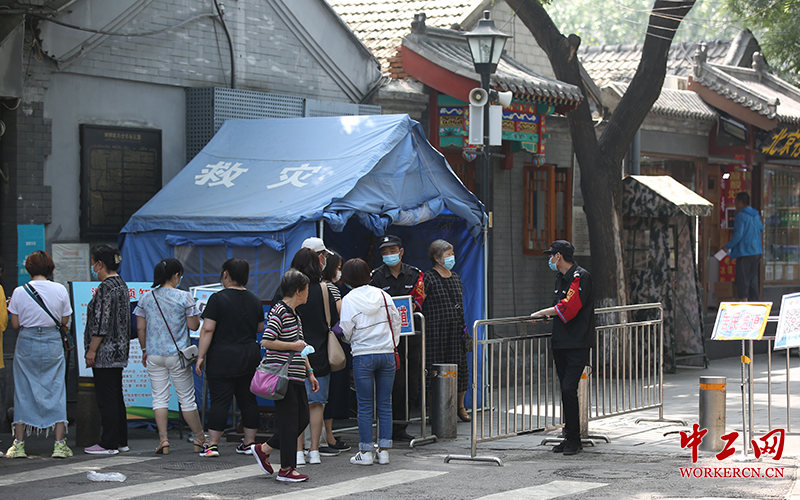 南锣鼓巷工作人员正在帮助游客扫码预约。