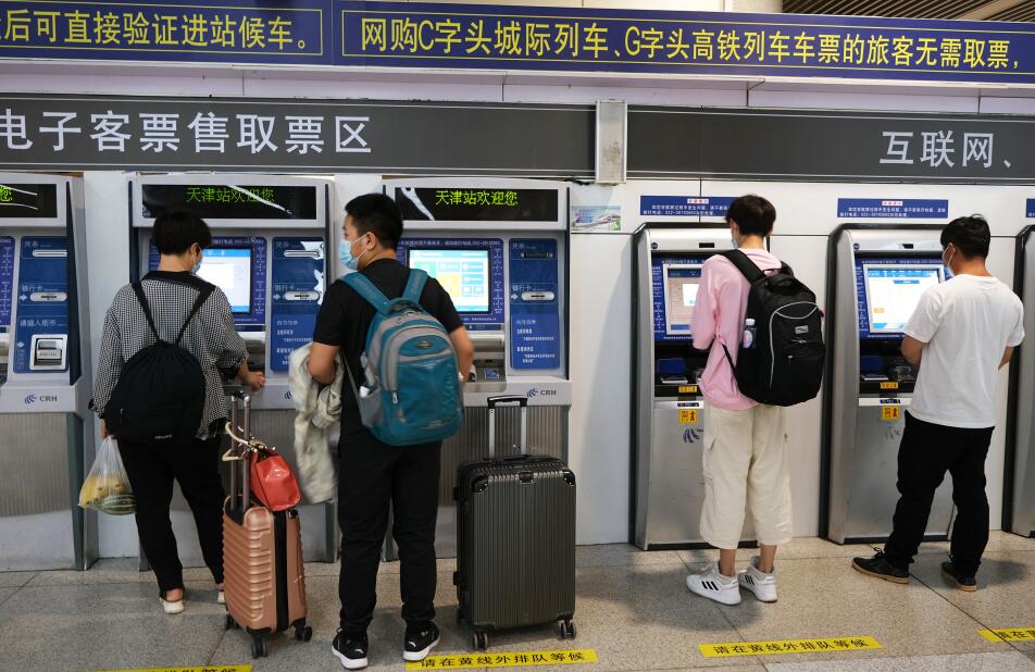 6月18日,旅客在天津站自助电子客票购票区有序购票。摄影 杨宝森