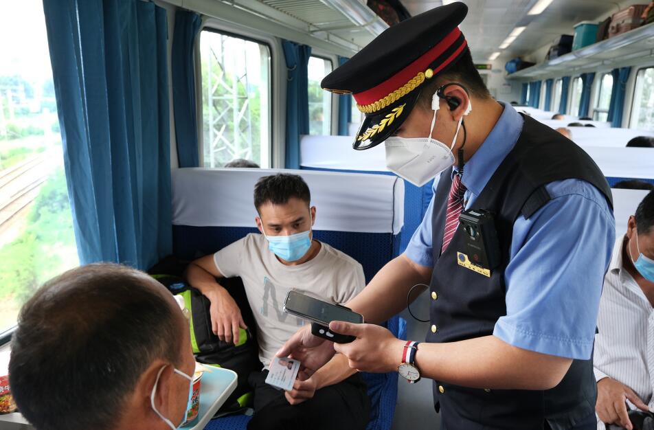 6月18日,铁路天津客运段乘务人员对乘坐天津开往广州的T252次列车的旅客查验身份证。摄影 杨宝森