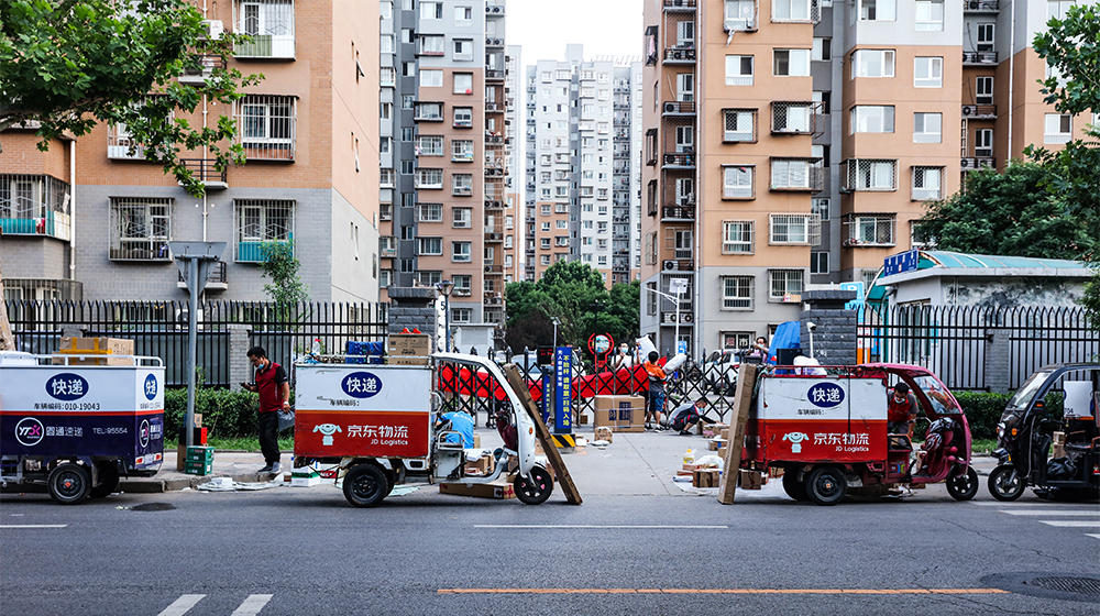 图为北京中风险地区的一所小区大门,快递小哥们派发各种快递。