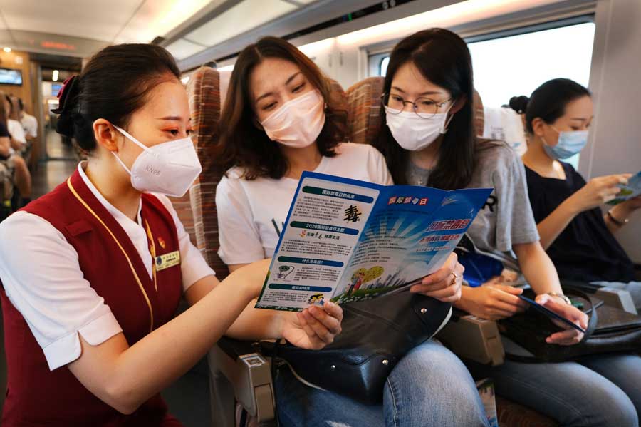 天津客运段乘务人员通过宣传册向旅客讲解识毒、拒毒、防毒常识。