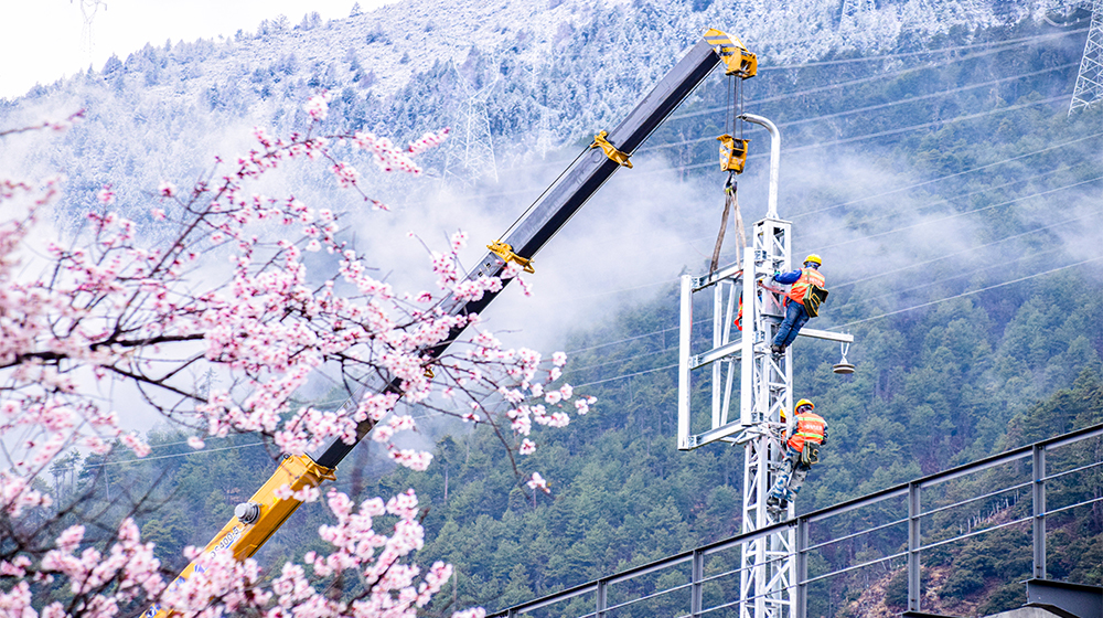 中铁电气化局拉林铁路施工人员在彩门二号桥安装大限界框架(任富阳摄)