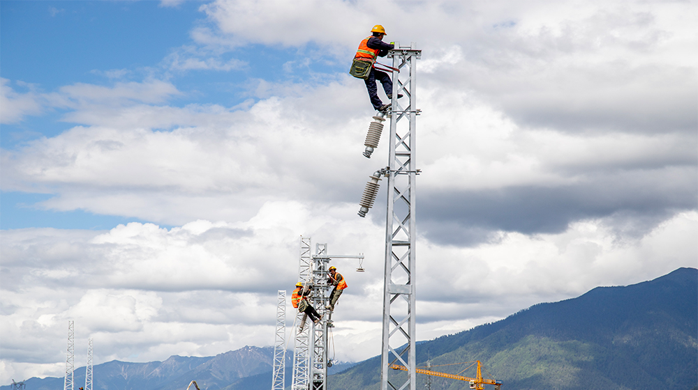 中铁电气化局拉林铁路施工人员在米林车站安装接触网补偿装置(任富阳摄)