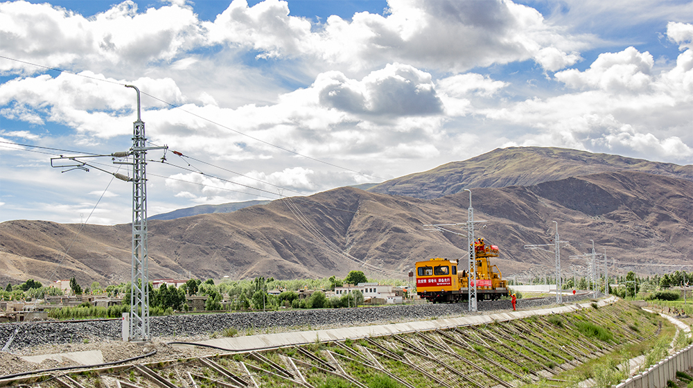中铁电气化局拉林铁路施工人员在扎囊至扎其区间架设接触线(刘浩摄)