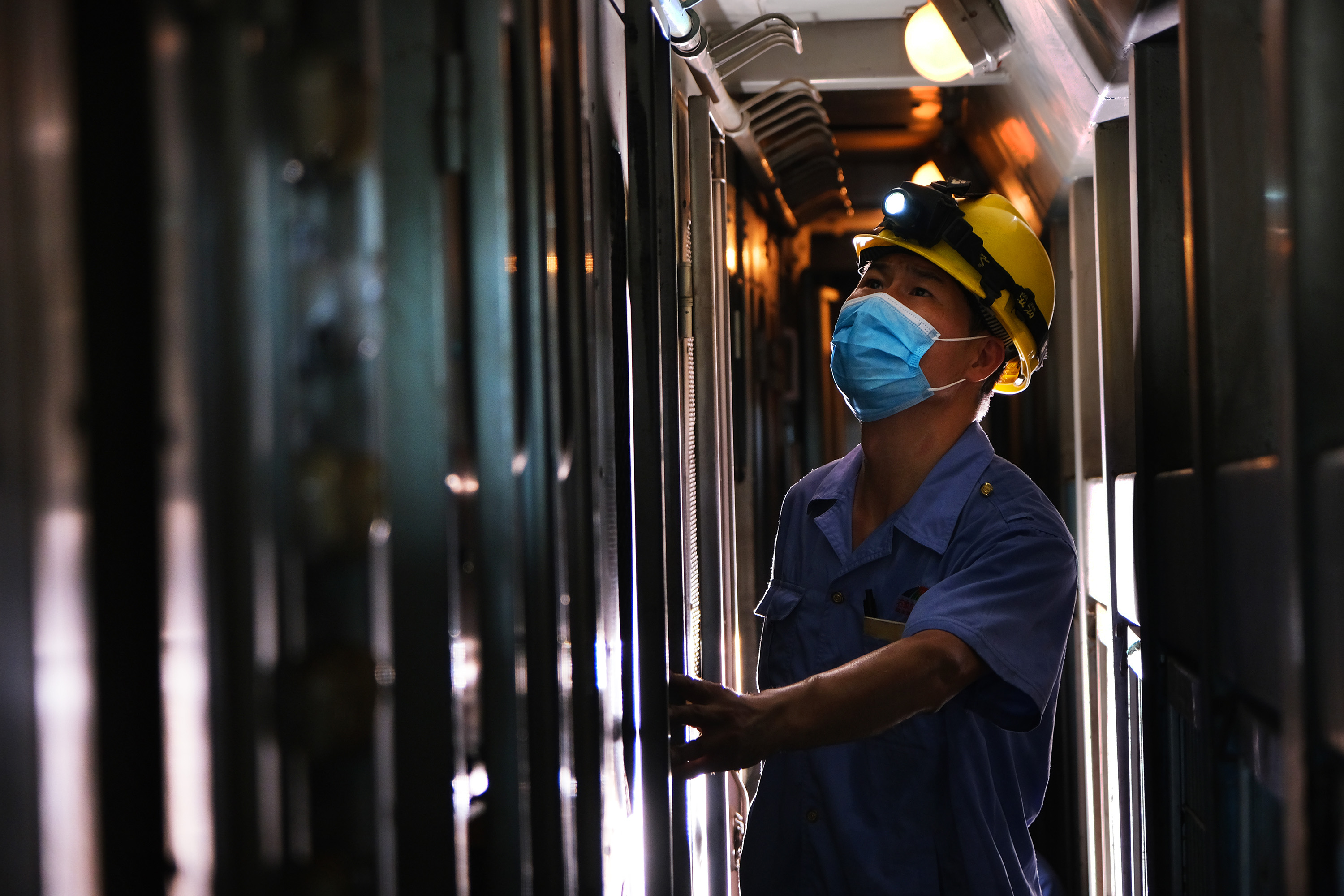 检修人员在机车内冒着摄氏50°以上高温检查机车电器系统。