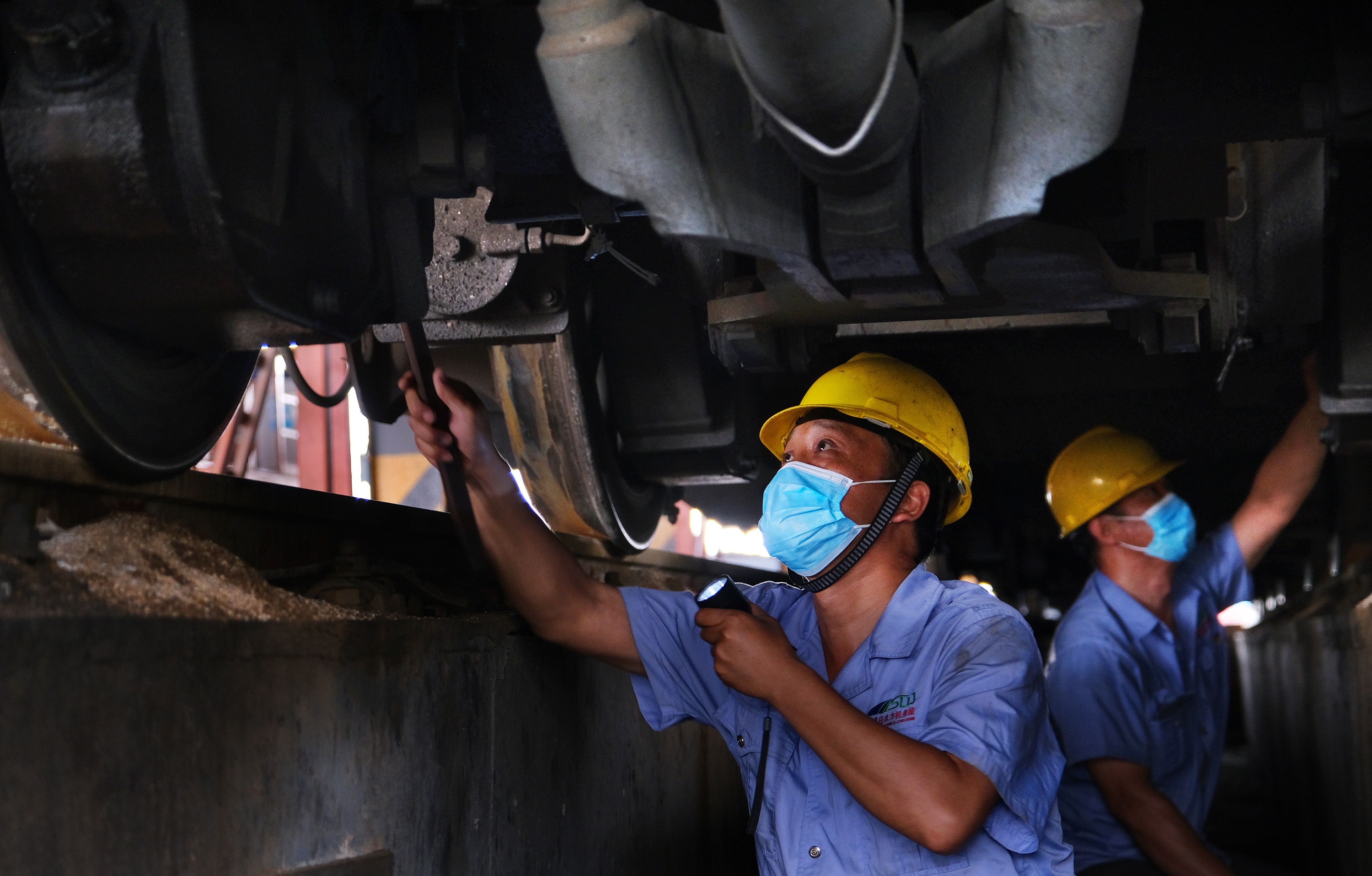 检修人员冒着高温酷暑对机车走行部位进行检修作业。