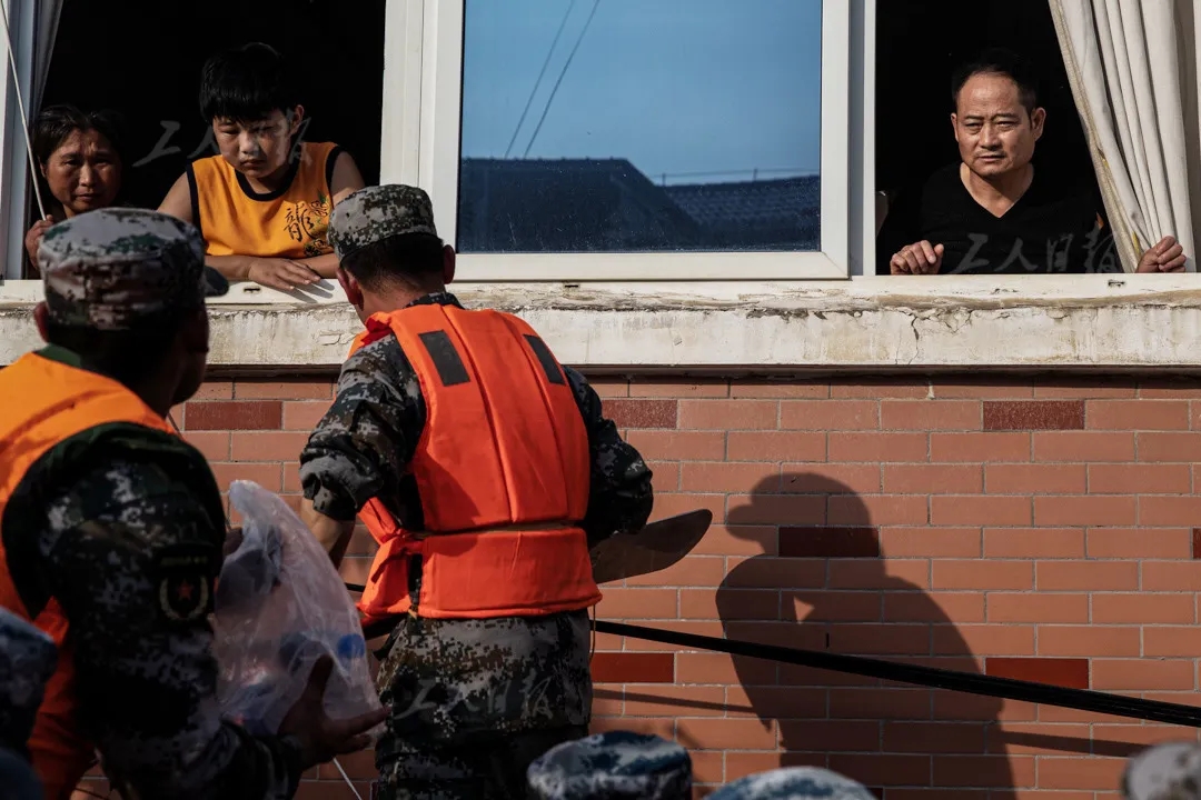 7月20日,救援人员通过二楼窗户为不愿撤离的受困群众分发水和食物。
