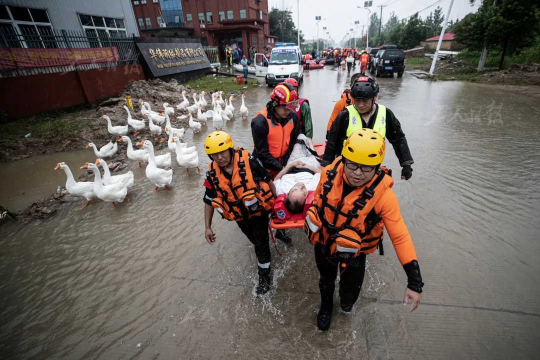 7月21日,固镇镇六合村,消防队员和社会救援人员正用担架将一名瘫痪老人送往救治点。