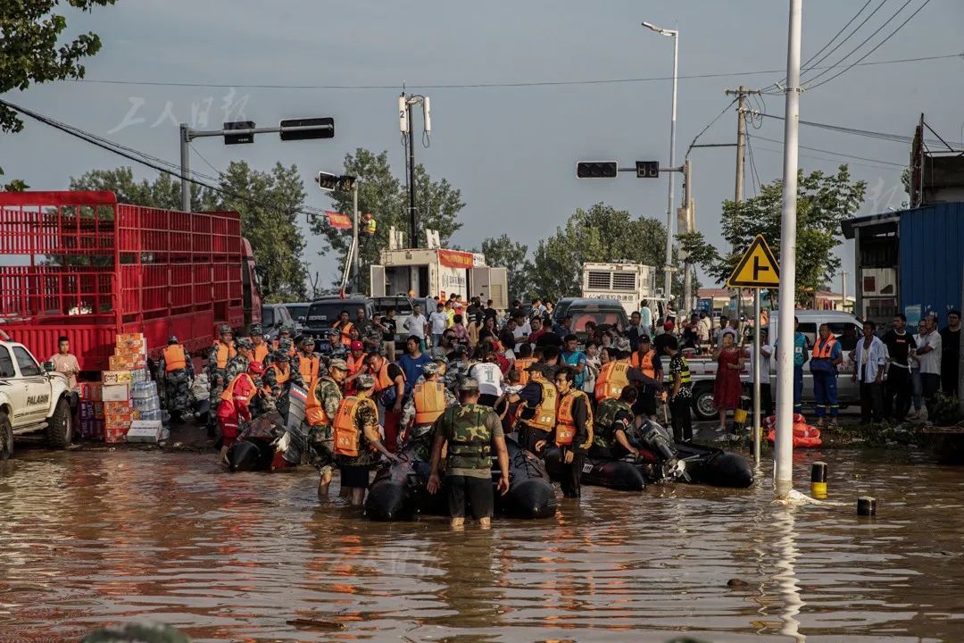 7月20日,固镇镇小河沿桥附近一处未被淹没的马路成了临时救援点。这里地势较高,空间相对宽阔,部分撤离的群众会被首先送到该处,然后再根据安排进行安置和转移。