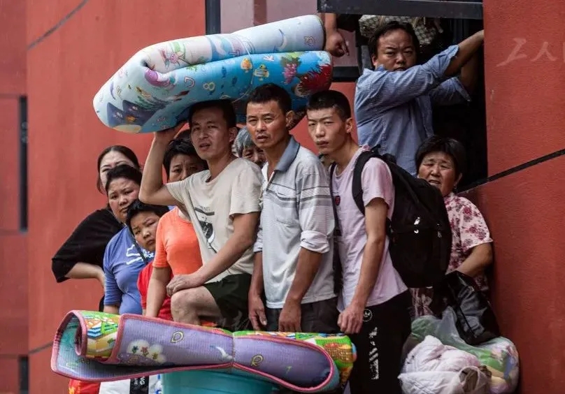 7月21日,固镇镇佛庵第二小学临时安置点,等待被转移出去的受困群众在二楼的平台上等待。