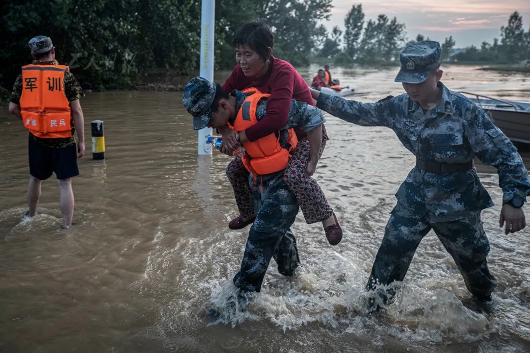 7月20日,两名战士正将转移出来的老人从救援船上背至位于小河沿桥的救援点。