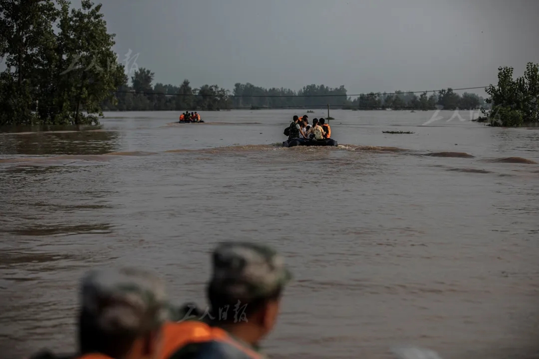 7月20日,救援人员驾驶皮艇和冲锋舟将受困群众转移出去。