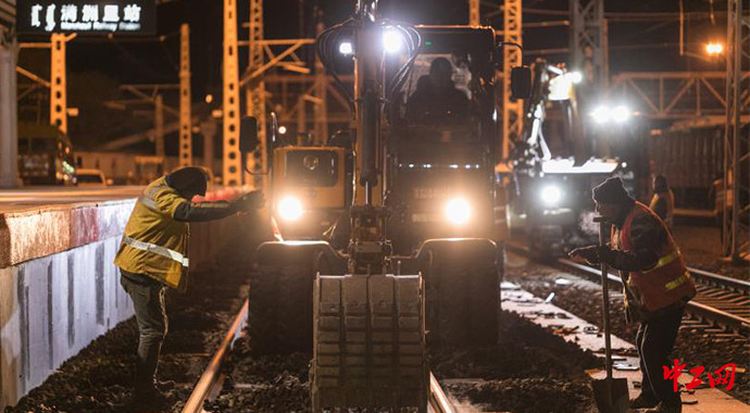 图为该段职工在滨洲线满洲里站内进行夜间施工作业。
