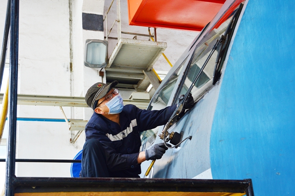 图为10月21日,株洲检修车间制动组职工在电力小辅修库调整和谐机车雨刷