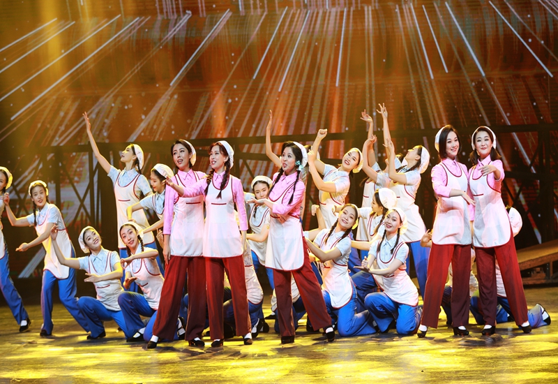 穿在《奋斗者之歌》演员身上的四百多套服装,出现在舞台上的数百件道具,都巧妙地融入了凸显年代特色、职业特色的元素,营造了浓郁的劳动风情。整体来看,随着剧情的发展,社会的变迁,工种不断丰富,服装的颜色也由黑蓝灰为主变得越来越艳丽,样式也由简单朴素演变得越来越丰富多彩;道具,也就是表演过程中使用的劳动工具、用具都紧密配合剧情,以细节提升质感,散发浓郁的年代感。所以制作团队在服装面料、道具材料,样式和工艺的选择上花费很大心思,甚至一些具体制作工艺也完全与新中国成立之始、改革开放之初等时期采用相同手法,已达到最佳效果。