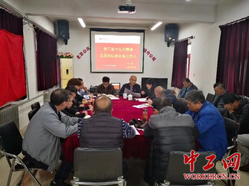 2018年11月14日下午14点,电车分公司一队55路工会组织全体管理人员及工会委员,认真学习中国工会十七大报告精神。